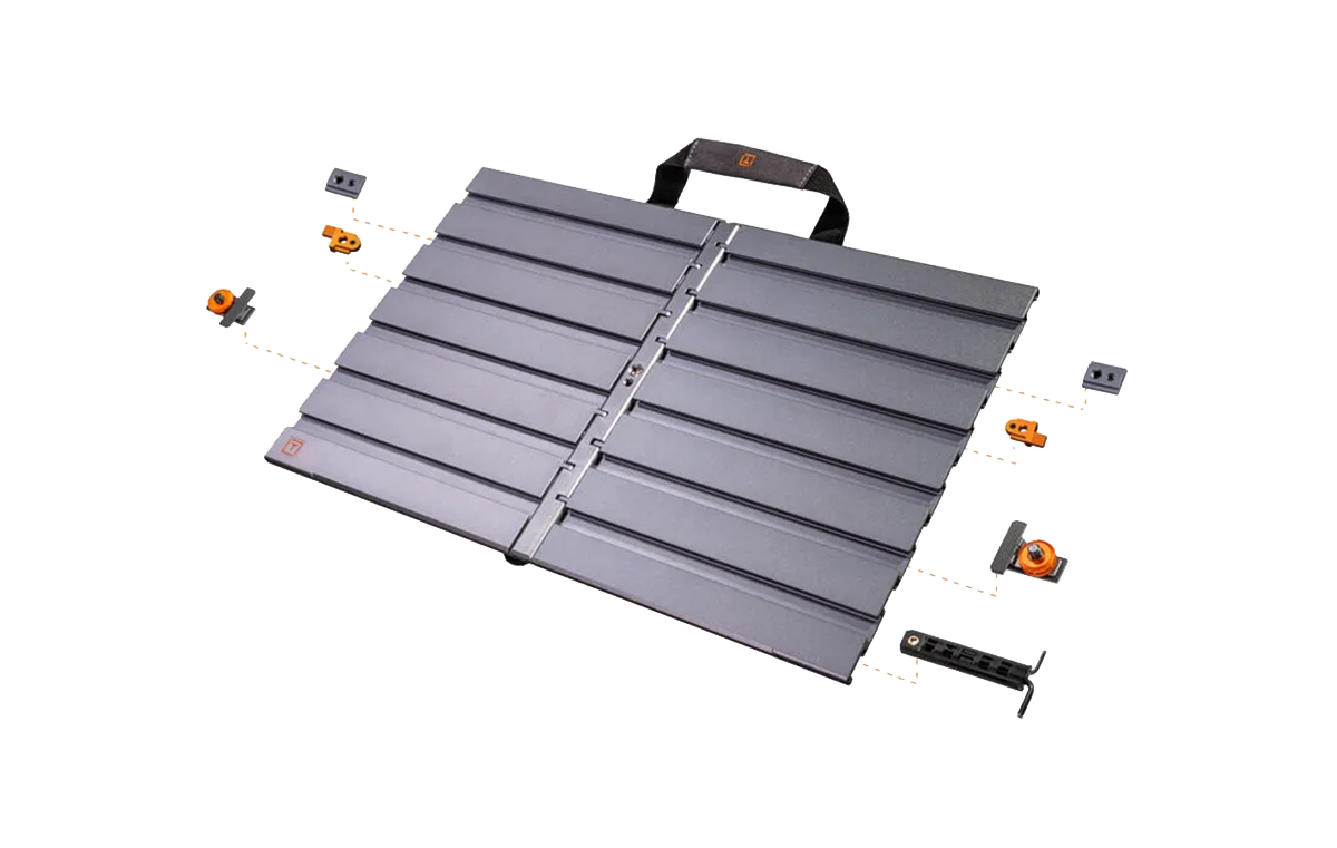 Die AeroTrac Workstation ist die perfekte mobile Arbeitsstation für Kreative, die unterwegs maximale Flexibilität benötigen. Gefertigt aus robustem, eloxiertem Aluminium und dennoch mit nur 1.5 kg extrem leicht, lässt sie sich kompakt zusammenklappen und mühelos transportieren. Das modulare Schienensystem ermöglicht eine präzise und vielseitige Befestigung von Geräten wie Laptops, Tablets oder Kamera-Zubehör sowohl ober- als auch unterhalb der Arbeitsfläche, wobei alles auch während Transport und Aufbau sicher fixiert bleibt.